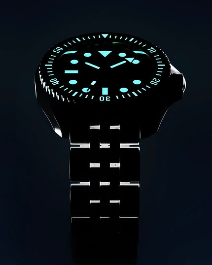 Inside, the watch is powered by a Swiss Soprod P024 automatic movement—reliable, precise, and built for real-world use. Rated for 200 meters of water resistance, it offers outstanding legibility thanks to blue-emission Super-LumiNova on the hands, indices, and bezel.