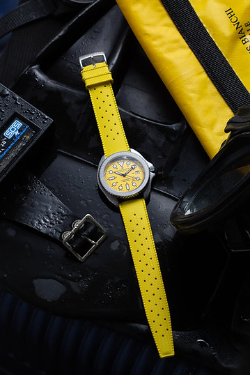 - Yellow rubber Tropic-style strap with stainless steel tang buckle