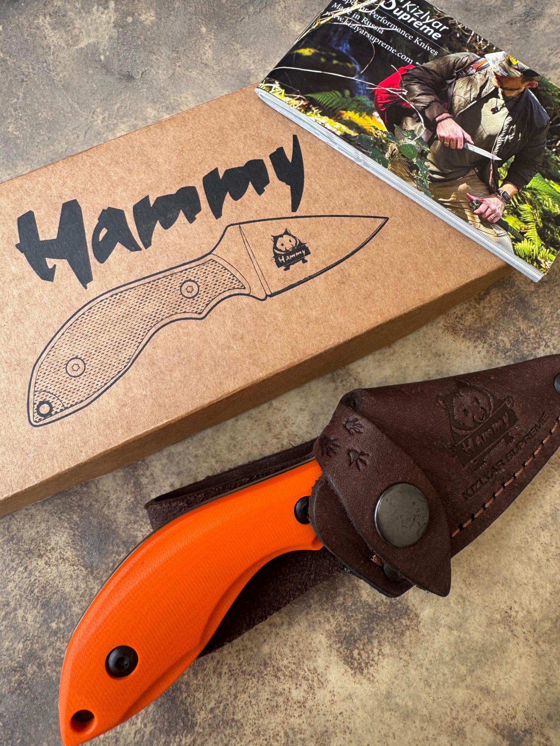 Kizlyar Supreme Hammy is a typical EDC knife with outstanding design. Many will appreciate the full flat grind with secondary bevel. The new Niolox stainless steel undergoes heat treatment in Nitrogen which adds to steel hardness. Genuine Brown color leather sheath allows you to wear the knife both vertically and horizontally which is quite handy for a compact size EDC knife.