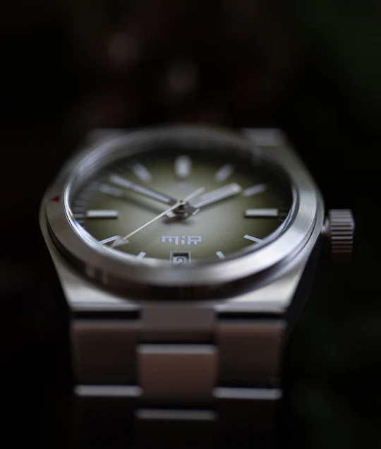 The new 8001’s organic green fumé dial is encircled by an imposing engineered bezel. The spoke-like radial pattern etched into the brushed stainless steel creates a sense of movement as it interacts with light. Norwegian industrial architecture often frames scenic features like fjords, forests, and mountains, making nature a central element of the design.