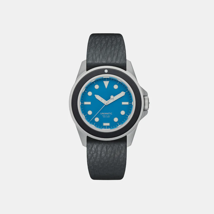 UNIMATIC Modello Uno UT1-ASÂ is the Made in Italy quartz dive watch. It features a matte black bezel insert, Alpine sky dial with hand-applied 3D UNILIGHT markers, dark gray open second rail and dial trims.