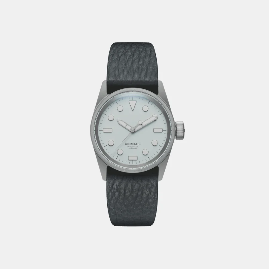 The watch comes on a fumo deer leather two-piece quick-release strap with sandblasted stainless steel hardware signed UNIMATIC, fitting 22mm lugs.